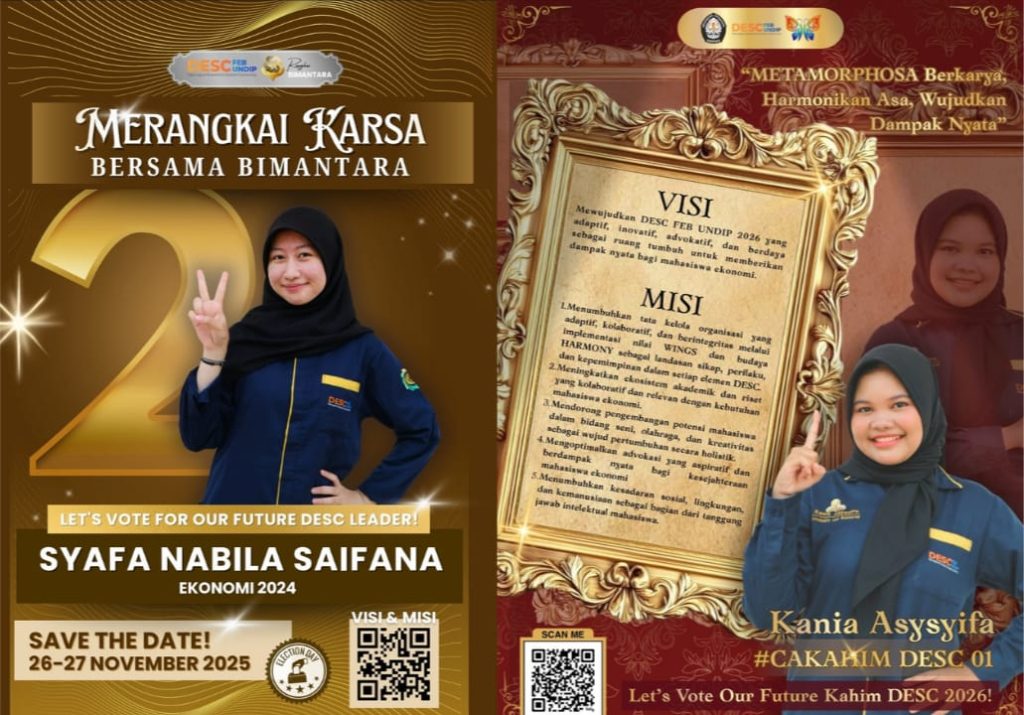Semarang 17 November 2025. Suasana ruang Gedung Hall C dipenuhi oleh mahasiswa yang antusias menghadiri Uji Publik Pemira DESC 2025, sebuah rangkaian penting dalam proses demokrasi mahasiswa Fakultas Ekonomika dan Bisnis. Dua kandidat dari angkatan Ekonomi 2024, Kania (Calon 1) dan Syafa (Calon 2), tampil untuk memaparkan visi, misi, serta program kerja unggulan mereka di hadapan panelis dan peserta.