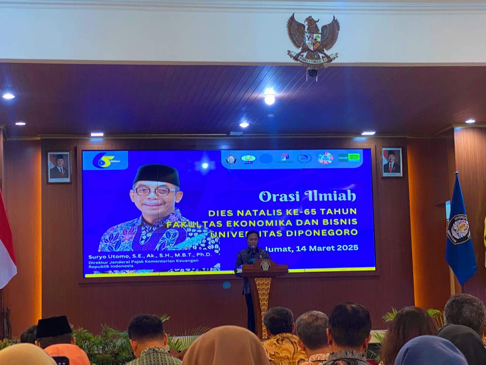 Orasi ilmiah dalam acara ini disampaikan oleh alumni Prodi Akuntansi FEB Undip angkatan 1986, Suryo Utomo, S.E., Ak., S.H., M.B.T., Ph.D., yang kini menjabat sebagai Direktur Jenderal Pajak Kementerian Keuangan Republik Indonesia. Dalam orasinya, ia mengutip pernyataan bahwa dua hal yang tidak bisa dihindari adalah kematian dan membayar pajak. Ia juga menyoroti penurunan minat terhadap jurusan Akuntansi dan menekankan bahwa ilmu perpajakan bersifat dinamis dan harus selalu beradaptasi dengan perkembangan zaman, seperti penerapan sistem pembayaran digital QRIS. Pajak, sebagai sumber utama pendapatan negara, diberlakukan secara tegas sebagaimana diatur dalam Amandemen Undang-Undang Dasar 1945 Pasal 23.