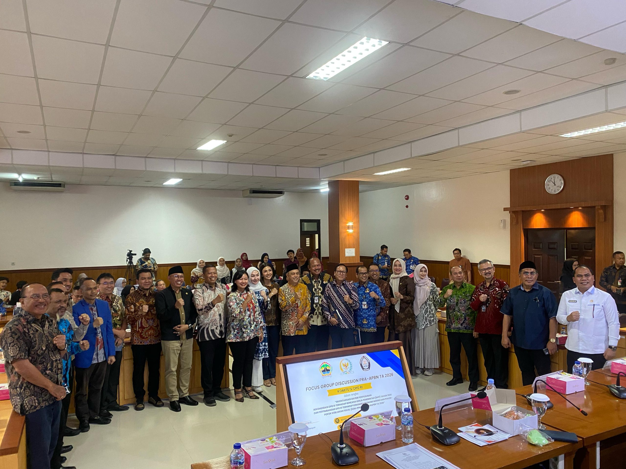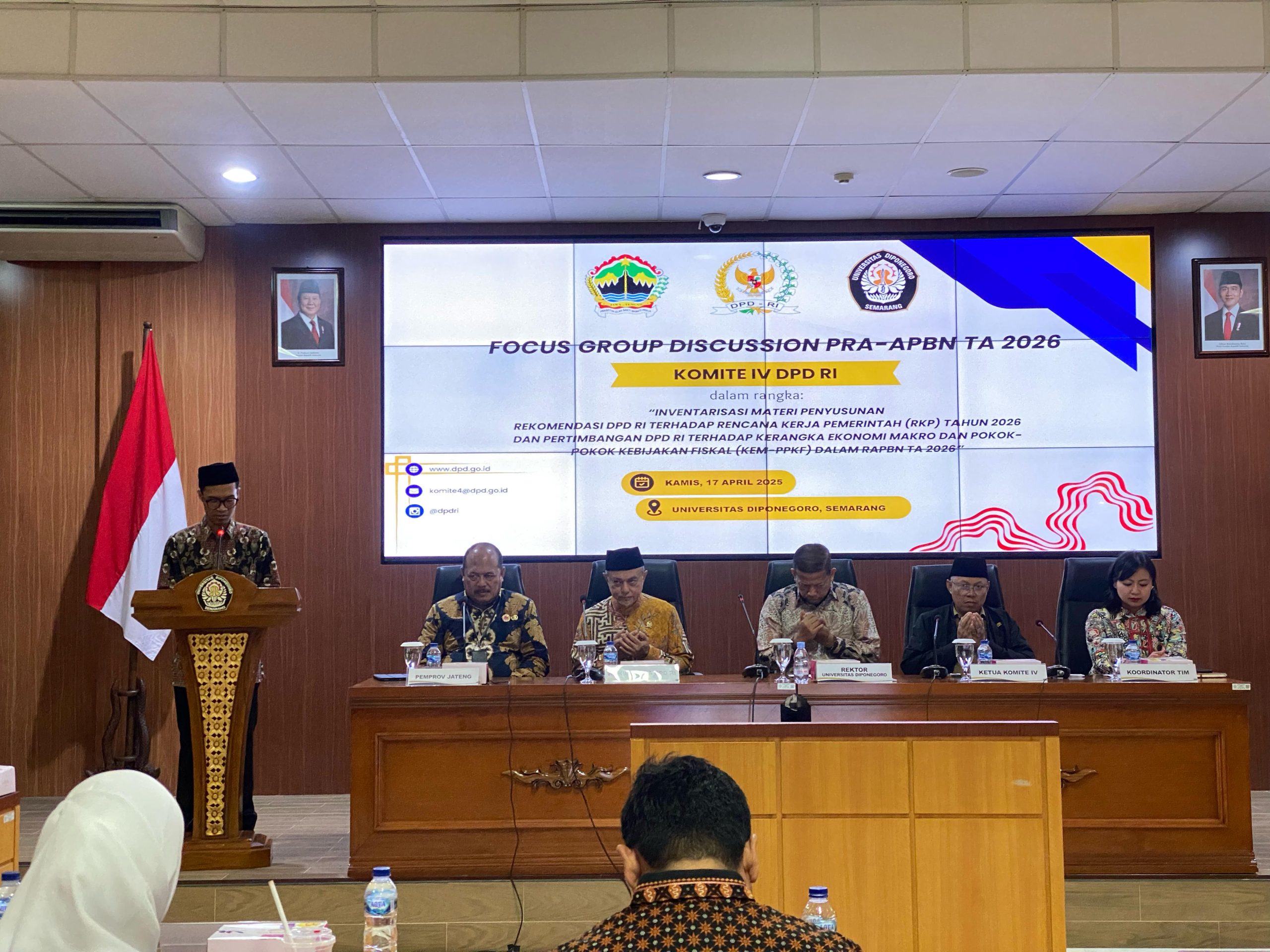 Semarang, 17 April 2025 – Komite IV Dewan Perwakilan Daerah Republik Indonesia (DPD RI) bersama dengan Fakultas Ekonomika dan Bisnis (FEB), Universitas Diponegoro (Undip) menggelar Focus Group Discussion (FGD) Pra – Anggaran Pendapatan dan Belanja Negara Tahun Anggaran (APBN TA) 2026 dalam rangka inventarisasi materi penyusunan rekomendasi DPD RI terhadap Rencana Kerja Pemerintah (RKP) Tahun 2026 dan pertimbangan DPD RI terhadap kerangka ekonomi makro dan pokok – pokok kebijakan fiskal (KEM-PPKF) dalam RAPBN TA 2026.