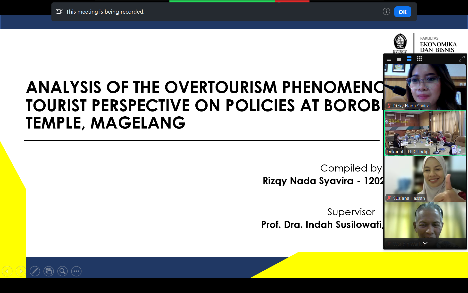 Partisipasi dalam kegiatan ini tidak hanya memberikan pengalaman riset lintas negara, tetapi juga mendukung penyelesaian project paper berjudul “Analysis of the Overtourism Phenomenon and Tourist Perspective on Policies at Borobudur Temple, Magelang.” Ujian project paper tersebut berlangsung pada 21 Agustus 2025 dengan menghadirkan external examiner, Dr. Suzuana Hassan, dari Pusat Kajian Pembangunan Inklusif & Lestari (SID), UKM. Berkat bimbingan dan masukan akademis yang intensif, hasil akhir penelitian ini berhasil meraih predikat yudisium Excellent.